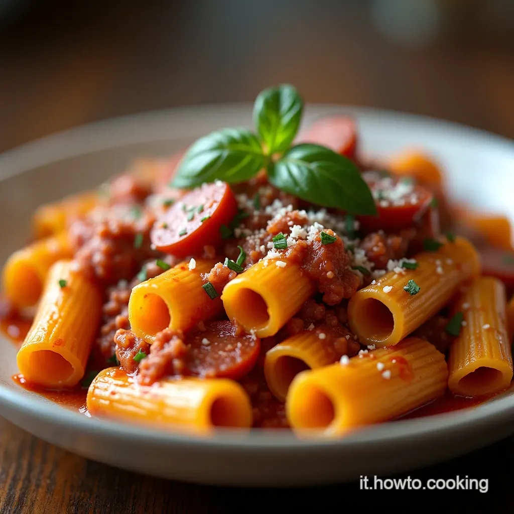 Ricapitolando brevemente per la preparazione: 400g di rigatoni, 450g di salsiccia, 700ml di passata di pomodoro, il vostro soffritto (carota, sedano, cipolla), 120ml di vino, e gli agenti cremosi menzionati. Con queste proporzioni, otterrete un condimento ricco che veste generosamente ogni pezzo di pasta.
